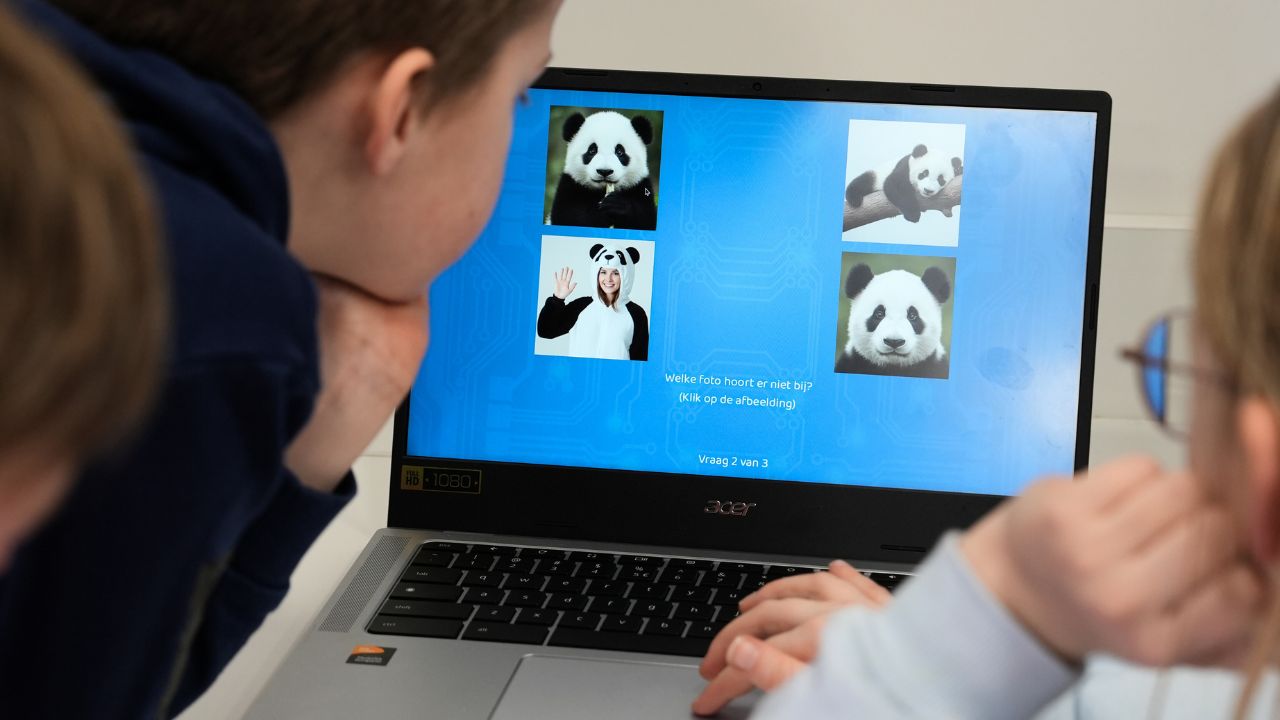 Four pictures of pandas appear on the screen. Or rather… three pandas. In one image, there is a person wearing a panda costume. ‘That one doesn’t belong!’ a pupil immediately calls out. But it turns out that an AI system sometimes identifies the disguised person as a panda as well.